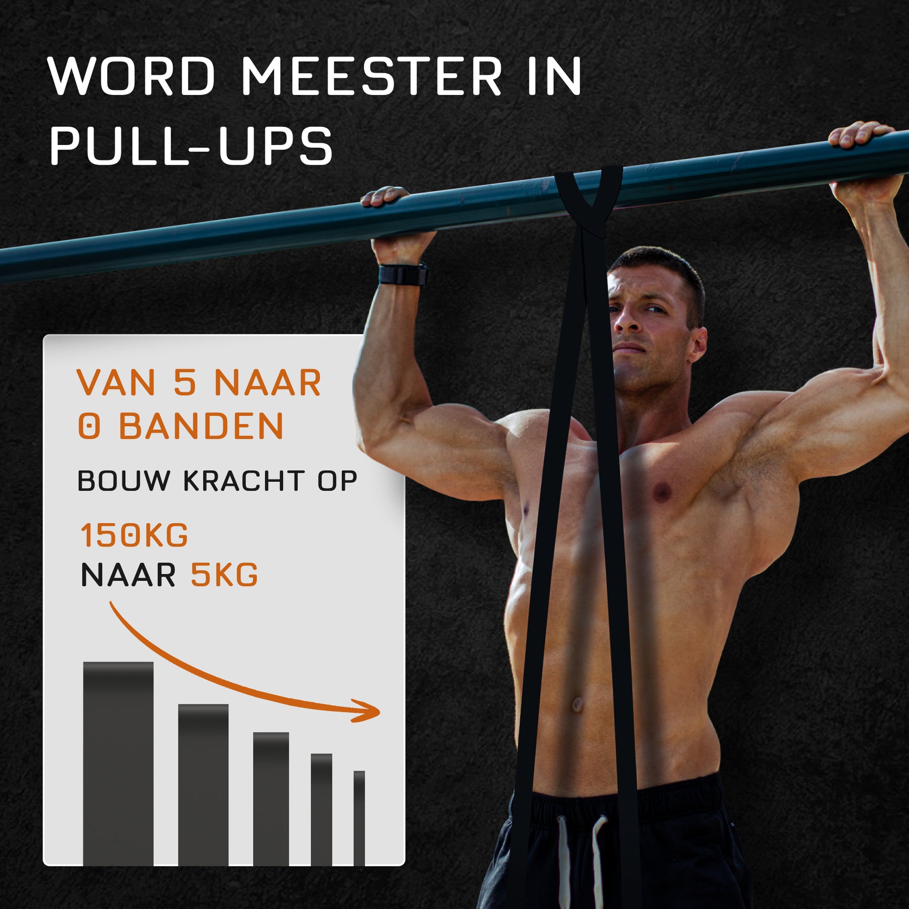 De banden zijn ontworpen om je stap voor stap sterker te maken. Start met meer ondersteuning bij pull-ups en bouw langzaam af tot je volledig zelfstandig optrekt. Ook bij krachttraining voeg je eenvoudig extra weerstand toe door meerdere banden te combineren.