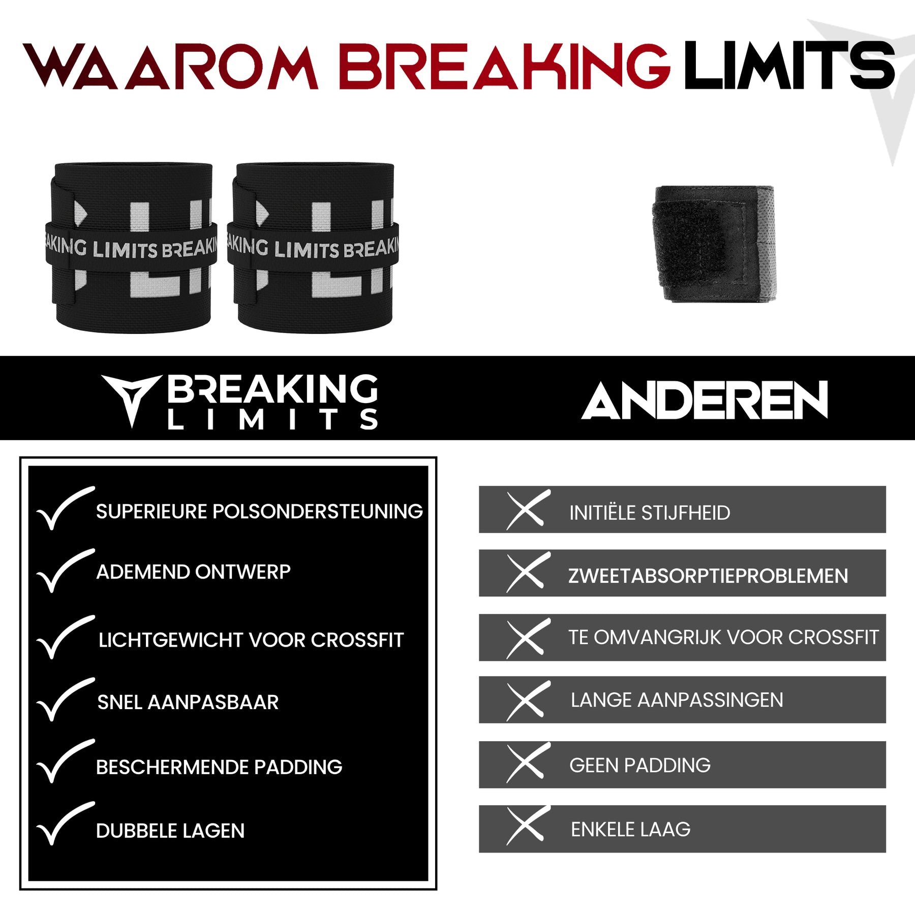 Ben je het zat dat je polsen pijn doen tijdens het tillen van zware gewichten? Met de Breaking Limits CrossFit Wrist Wraps stabiliseer je je polsen, verminder je de druk en kun je zwaarder tillen zonder zorgen. Ideaal voor Crossfitters die het maximale van hun polsen vragen tijdens zware WOD’s.