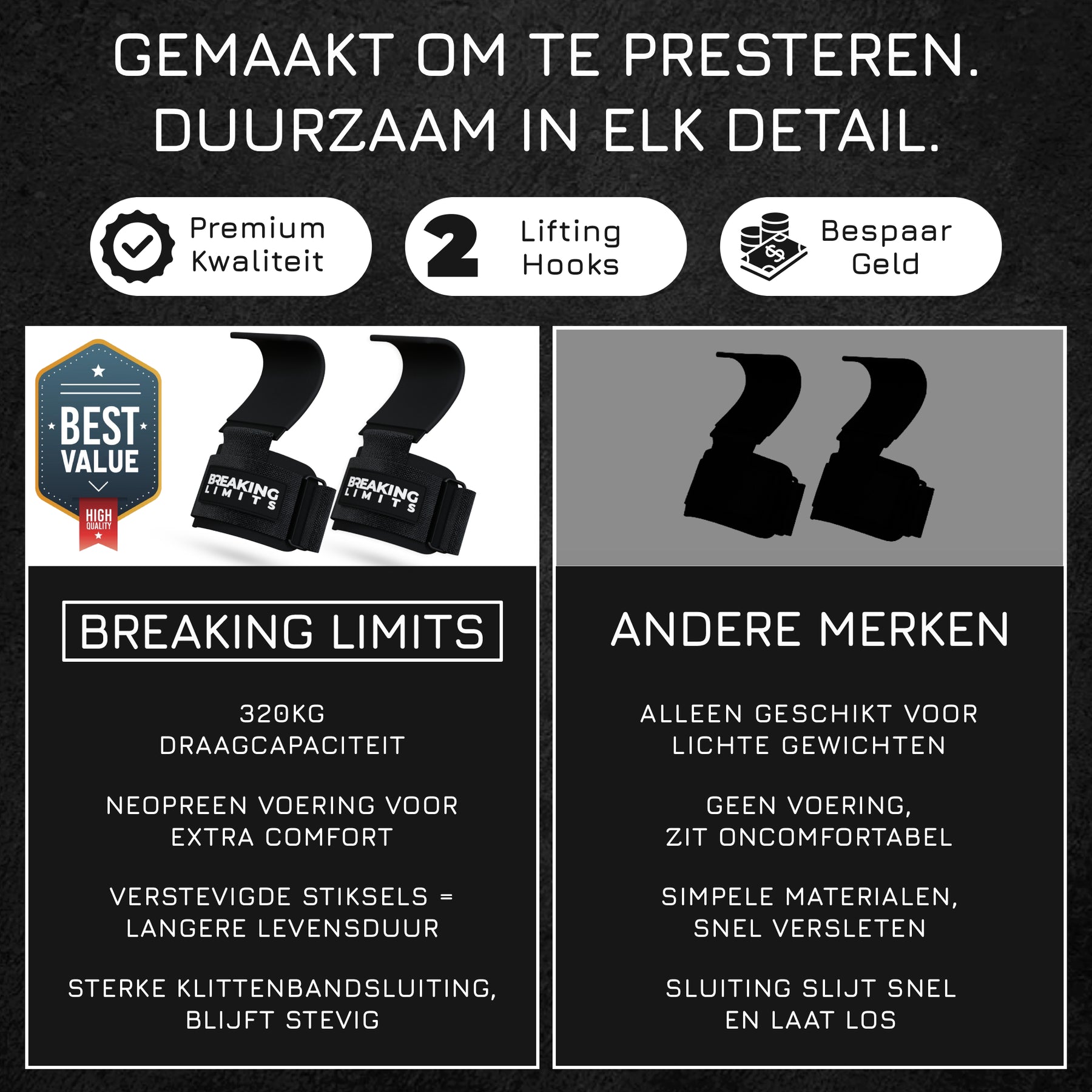 Hooks nemen het gripwerk volledig over, terwijl straps je alleen helpen je grip te versterken. Daardoor kun je met hooks meer gewicht tillen en je volledig focussen op je uitvoering en kracht.